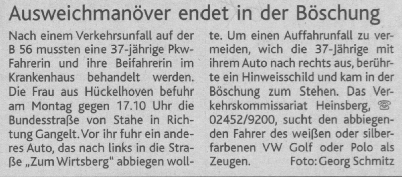 Die Löschgruppen Gangelt und Stahe-Niederbusch wurden heute Nachmittag zu einem schweren Verkehrsunfall auf der Bundesstraße 56 in Höhe des Wirtsberg alarmiert.