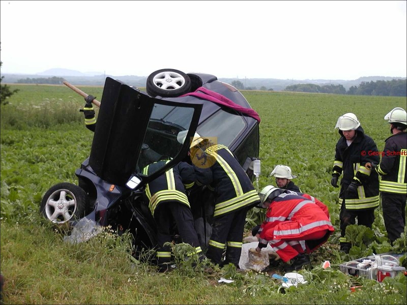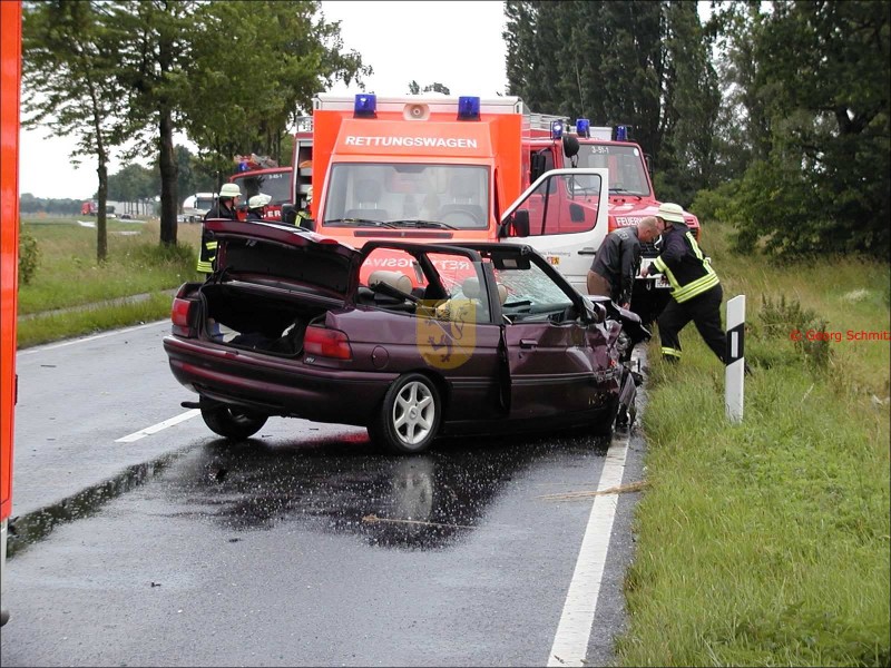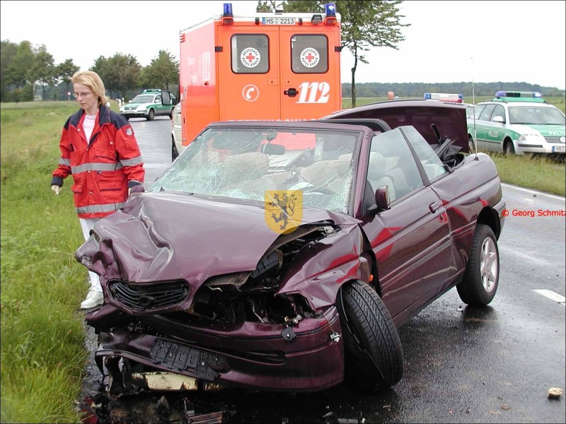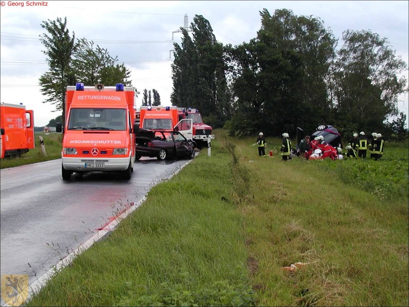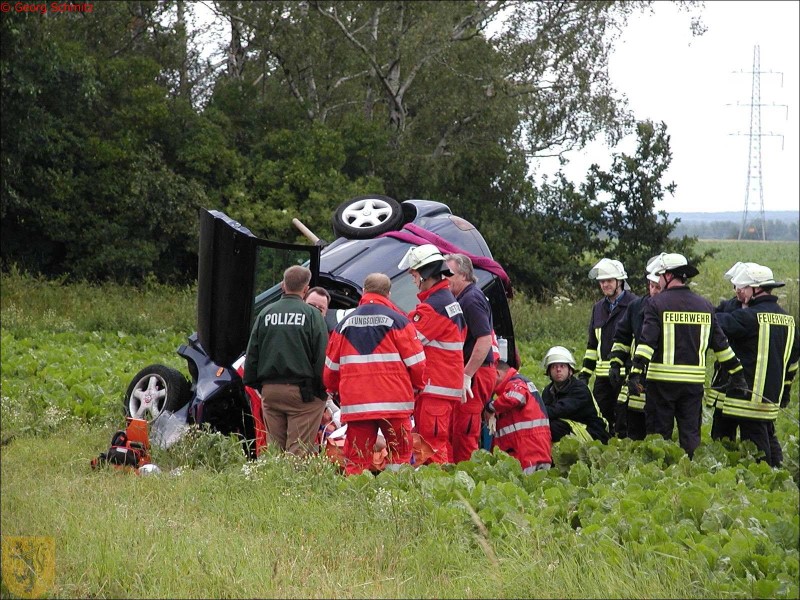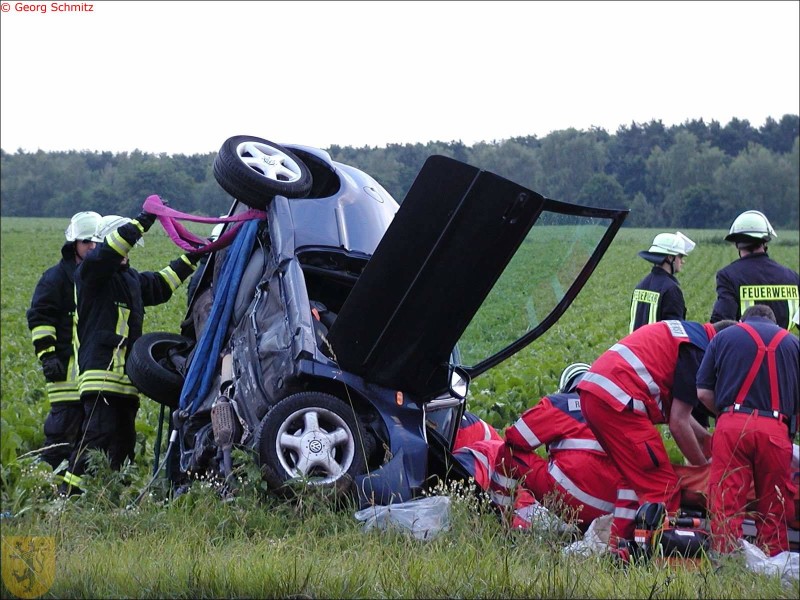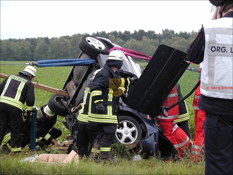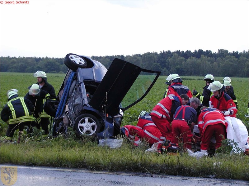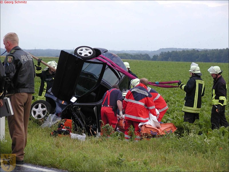 Als erster traf der Wehrleiter Günter Paulzen an der Einsatzstelle an und stellte fest, dass zwei Personen eingeklemmt waren und zwei weitere schwer verletzt. Aus diesem Grund ließ Wehrleiter Günter Paulzen die Löschgruppe Breberen nachalarmieren. Aufgrund der Einsatzlage löste die Leitstelle den MANV1 aus. Das bedeutet auf Seite des Rettungsdienstes ein Großalarm mit Alarmierung des „OrgelRet“ (Organisatorischer Leiter des Rettungsdienstes). Weiterhin wurde ein Rettungshubschrauber zur Einsatzstelle gerufen. Die Einsatzstelle forderte den Wehrmännern ihr ganzes Können ab. Ein Ford Escord Cabrio mit eingedrückter Motorhaube stand auf der Fahrbahn stehen und ein VW Polo stand mit der Front nahezu Senkrecht im Feld. Aus dem VW Polo hing eine Frau mit dem Kopf unten aus der Kabine raus. Zunächst wurde das Fahrzeug auf der einen Seite mit der Seilwinde des Rüstwagens und auf der anderen Seite wurde der Polo mit einem Mehrzweckzug (Greifzug) gesichert.