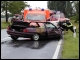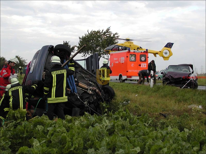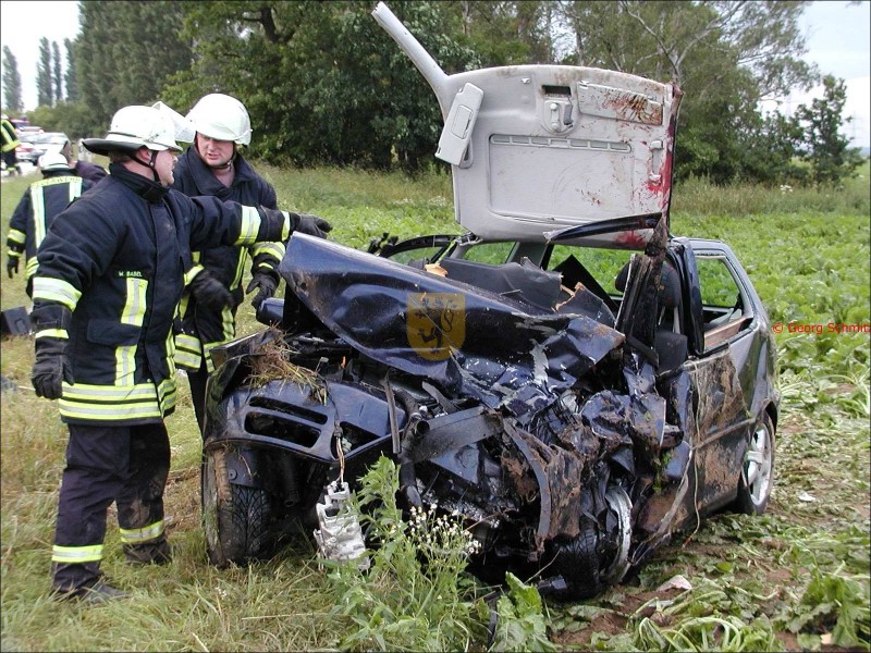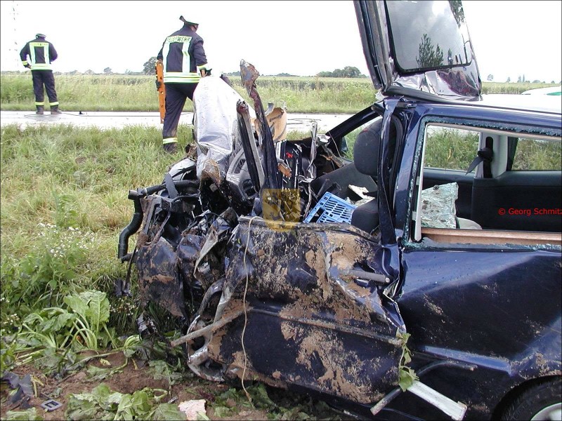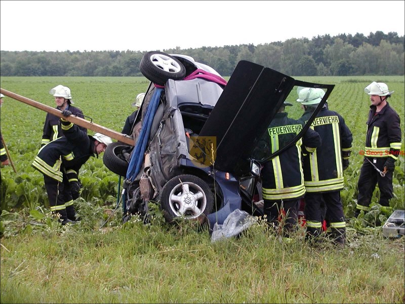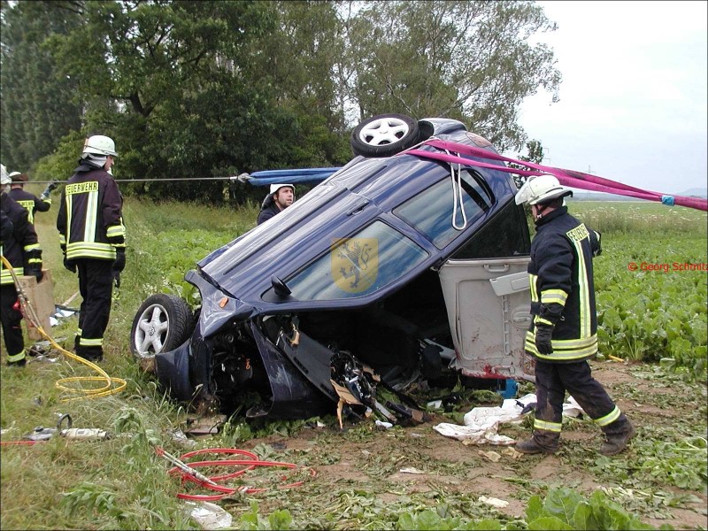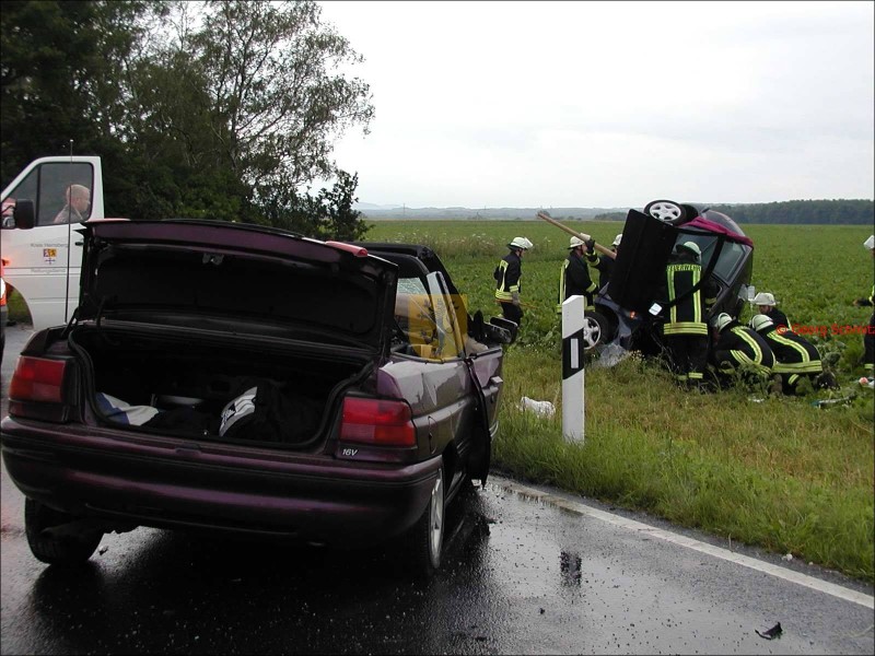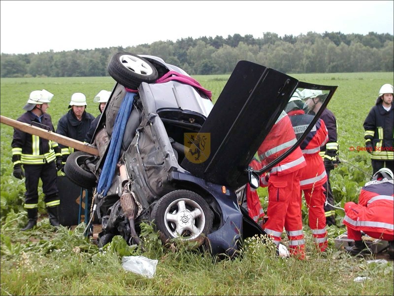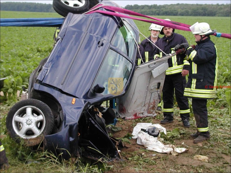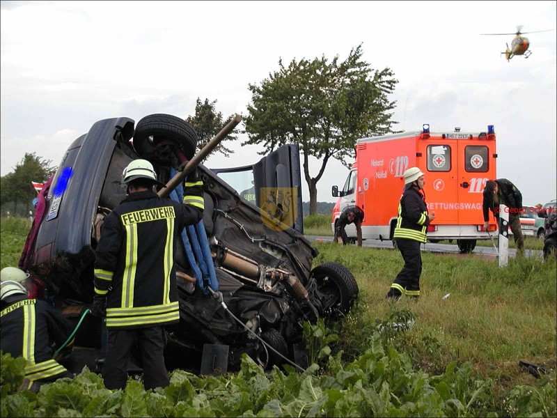 Als erster traf der Wehrleiter Günter Paulzen an der Einsatzstelle an und stellte fest, dass zwei Personen eingeklemmt waren und zwei weitere schwer verletzt. Aus diesem Grund ließ Wehrleiter Günter Paulzen die Löschgruppe Breberen nachalarmieren. Aufgrund der Einsatzlage löste die Leitstelle den MANV1 aus. Das bedeutet auf Seite des Rettungsdienstes ein Großalarm mit Alarmierung des „OrgelRet“ (Organisatorischer Leiter des Rettungsdienstes). Weiterhin wurde ein Rettungshubschrauber zur Einsatzstelle gerufen. Die Einsatzstelle forderte den Wehrmännern ihr ganzes Können ab. Ein Ford Escord Cabrio mit eingedrückter Motorhaube stand auf der Fahrbahn stehen und ein VW Polo stand mit der Front nahezu Senkrecht im Feld. Aus dem VW Polo hing eine Frau mit dem Kopf unten aus der Kabine raus. Zunächst wurde das Fahrzeug auf der einen Seite mit der Seilwinde des Rüstwagens und auf der anderen Seite wurde der Polo mit einem Mehrzweckzug (Greifzug) gesichert.