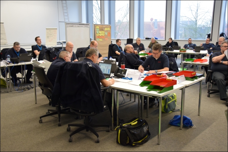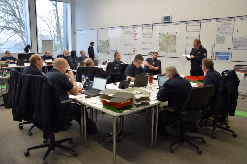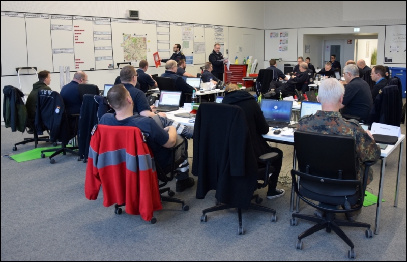 Die rund 60 Teilnehmer aus Kreisverwaltung, den Feuerwehren des Kreises, THW, Polizei, Bundeswehr, Rettungsdienst, Energieversorger NEW, Wasserverband Eifel-Rur und dem Deutschen Roten Kreuz stellten während der Krisenstabsübung am Institut der Feuerwehr NRW in Münster (IdF) die Kommunikation zwischen den Stäben auf die Probe, dokumentierten die jeweiligen Einsatzlagen, simulierten das Meldewesen und übten das Abrufen zusätzlicher Ressourcen. Das Übungsszenario war anspruchsvoll: Simuliert wurde ein Unwetterszenario, das zunächst Evakuierungen im südlichen Kreis Heinsberg notwendig machte und in dessen Folge es später auch im nördlichen Kreis Heinsberg zu Stromausfällen und Großbränden kam und sogar die Evakuierung des Erkelenzer Krankenhauses zur Diskussion stand.