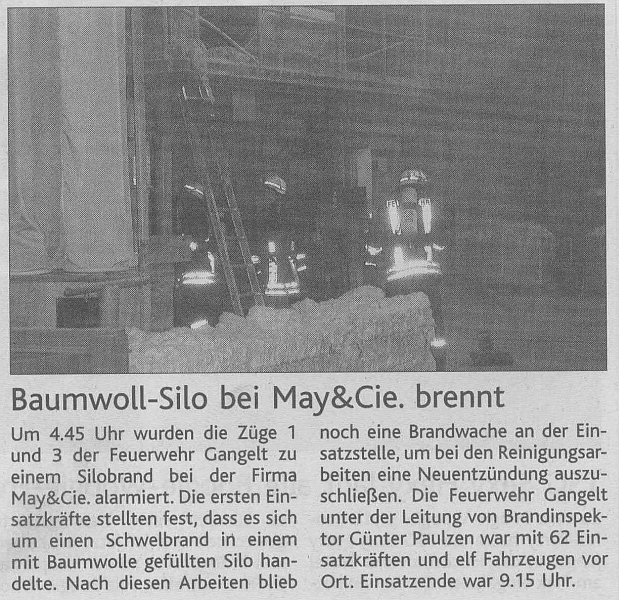 Zu einem Silobrand in der Baumwollspinnerei May und Cie wurden die Löschgruppen Gangelt, Stahe, Kreuzrath, Breberen, Langbroich und Hastenrath alarmiert.