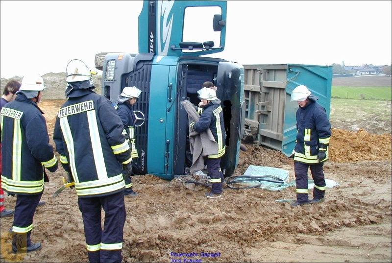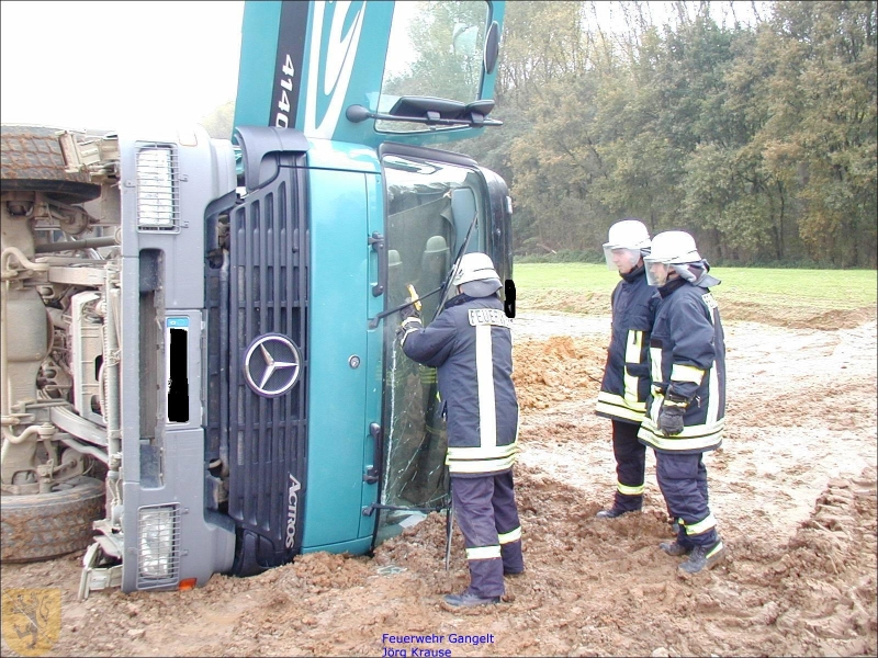 Auf dem Gelände der Kiesgrube der Schlun Umwelt GmbH an der K3 zwischen Breberen und Saeffelen kippte ein LKW um und blieb auf der Seite liegen.