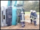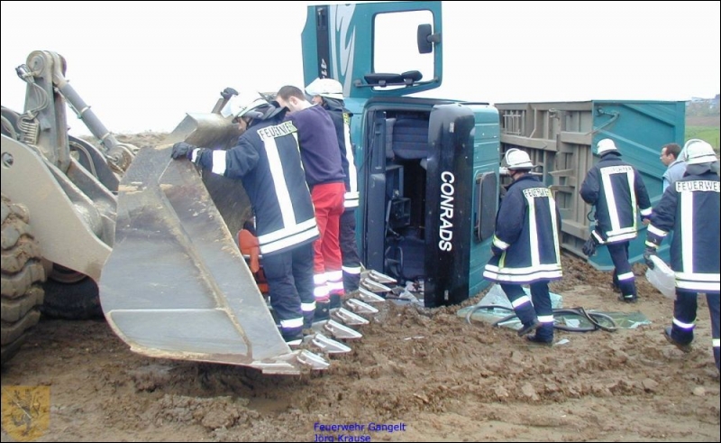 Die Löschgruppen Breberen, Stahe und Gangelt wurden daher alarmiert um den verletzten Fahrer aus dem Fahrzeug zu befreien. Aufgrund der nur schwer zugänglichen Einsatzstelle konnten die Löschfahrzeuge nicht bis zur Einsatzstelle durchfahren. Lediglich dem Rüstwagen gelang es zur Einsatzstelle durchzudringen. Daher sorgte der RW1 für den Transport des Rettungsdienstes und der Feuerwehrkameraden. Der Fahrer wurde anschließend befreit, indem die Frontscheibe mit der Glassäge entfernt wurde. Mit Hilfe eines Radladers konnte der verletzte Fahrer zum Rettungswagen transportiert werden