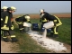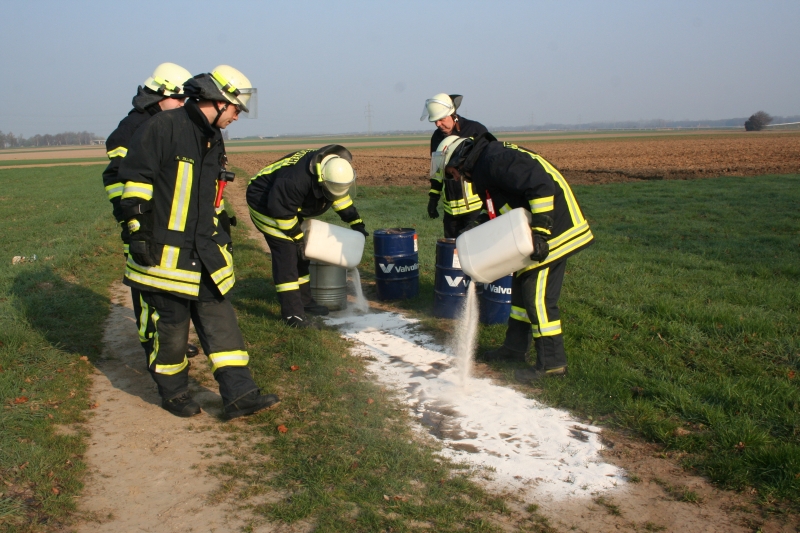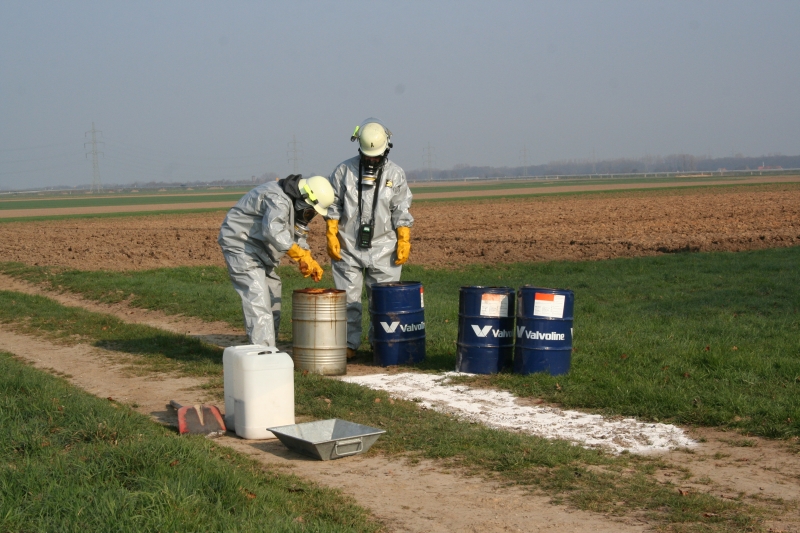 Zur Sicherheit wurde zusätzlich die Löschgruppe Stahe mit dem Gerätewagen Gefahrgut zur Einsatzstelle gerufen. Diese überprüfte unter Einsatz von leichten Schutzanzügen den Inhalt der Fässer.