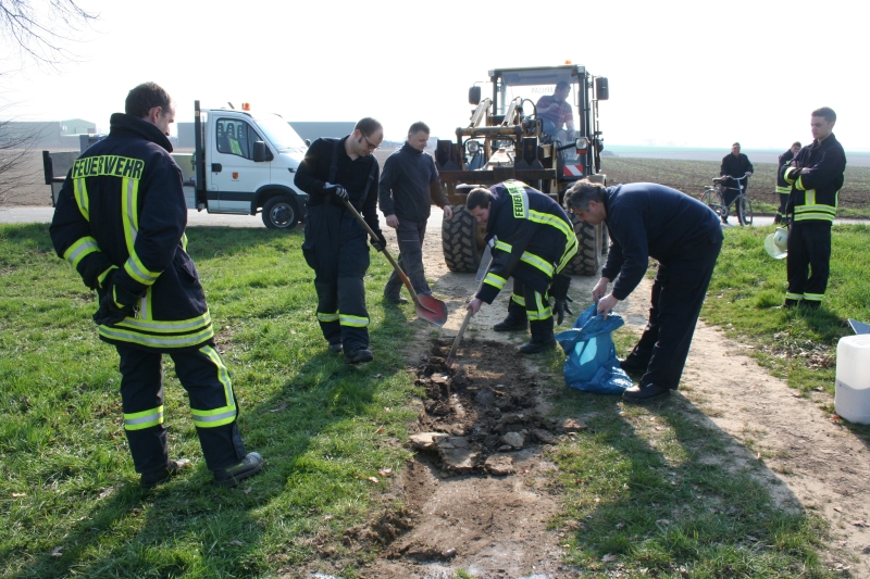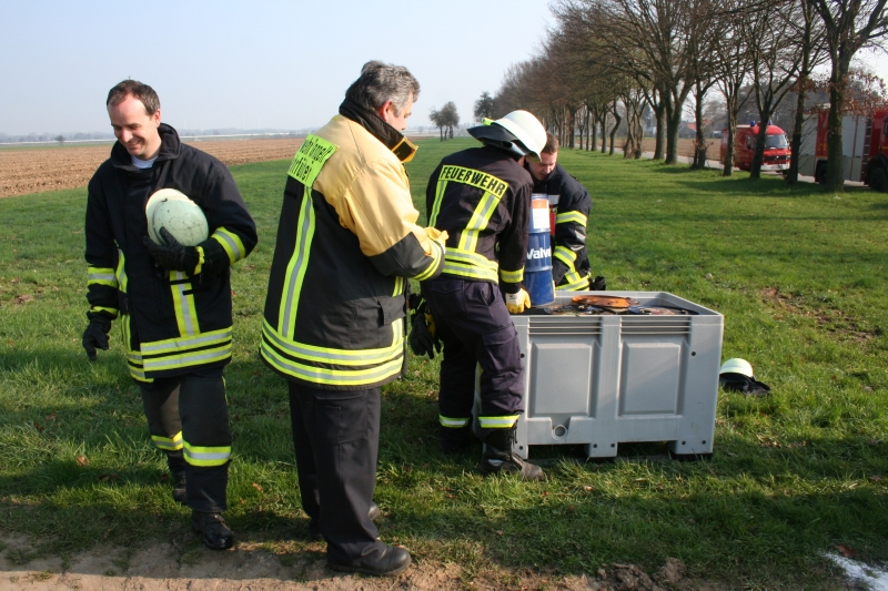 Als klar war, dass auch diese nur mit Altöl gefüllt waren, wurden die Fässer mit Unterstützung des Bauhofes der Gemeinde Gangelt abtransportiert. Auch das Erdreich, in das bereits Öl eingedrungen war, wurde zur Entsorgung aufgenommen.