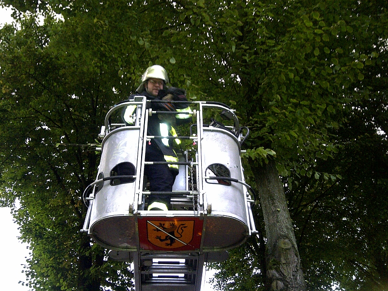 Am frühen Morgen bemerkten Anwohner eine junge Katze in der Krone eines Baums an der Franz-Savels-Straße. Das Tier saß in einer Astgabel und konnte von selbst nicht mehr den Baum verlassen. Mit Hilfe der Drehleiter konnte die Feuerwehr die Katze aus ihrer Lage befreien und sicher zurück auf den Boden bringen.