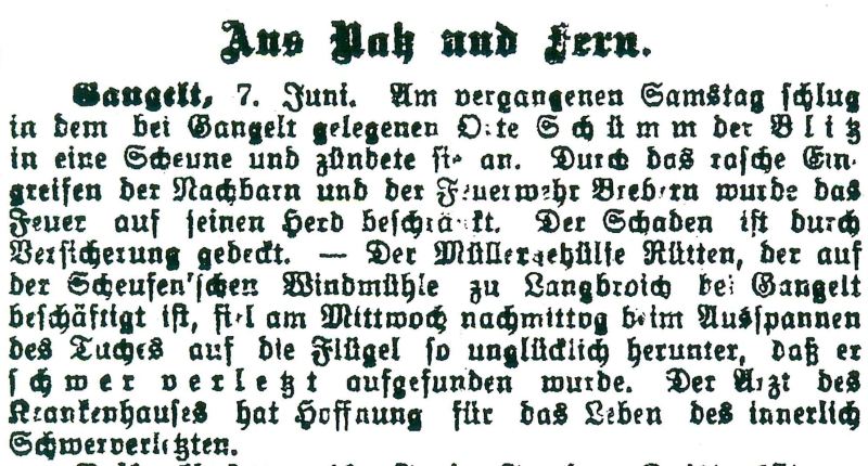 Gangelt, 7. Juni. Am vergangenen Samstag schlug in dem bei Gangelt gelegenen Orte Schümm der Blitz in eine Scheune und zündete sie an.