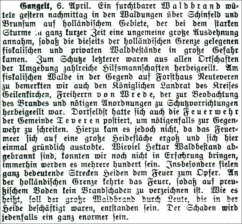 Zum Schutze letzterer waren aus allen Ortschaften der Umgebung zahlreiche Hilfsmannschaften herbeigeeilt. Am fiskalischen Walde in der Gegend auf Forsthaus Neuteveren zu bemerkten wir auch den königlichen Landrat des Kreises Geilenkirchen, Freiherr von Wrede, der zur Beobachtung des Brandes und nötigen Anordnungen zu Schutzvorrichtungen herbeigeeilt war. Dortselbst hatte sich auch die Feuerwehr der Gemeinde Teveren postiert, um nötigenfalls zur Gegenwehr zu schreiten. Hierzu kam es jedoch nicht, da das Feuermeer sich auf eine große Heidefläche ergoß und sich hier einmal gründlich austobte. Wieviel Hektar Waldbestand abgebrannt sind, konnten wir noch nicht in Erfahrung bringen, immerhin werden es mehrere hundert sein. Insbesondere fielen ganz bedeutende Strecken Heiden dem Feuer zum Opfer. An der holländischen Grenze kehrte das Feuer, sodaß auf preußischem Boden kein Brandschaden zu verzeichnen ist. Wie es heißt, soll der große Waldbrand durch Leute, die in der Heide beschäftigt waren, entstanden sein. Der Schaden wird jedenfalls ein ganz enormer sein.