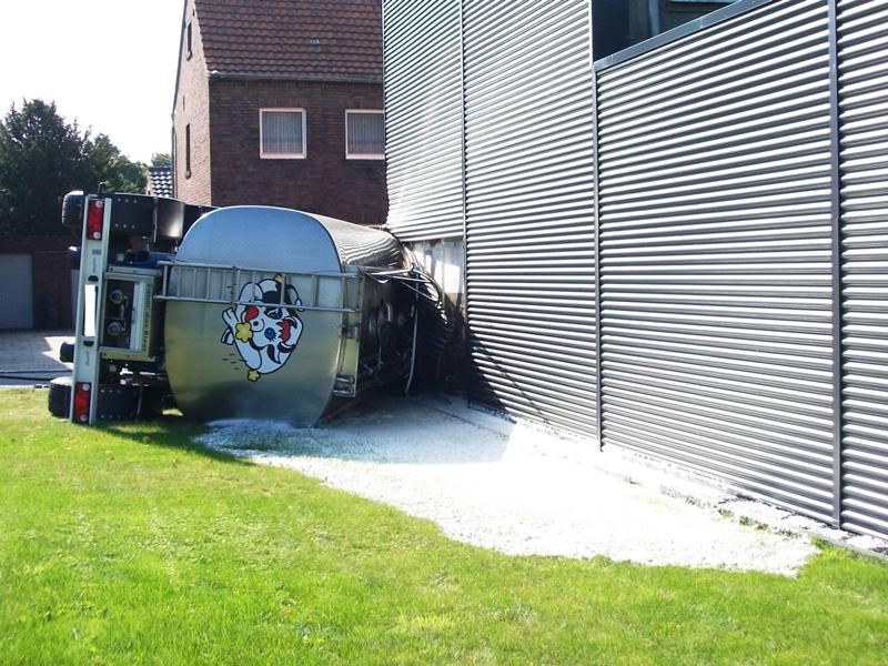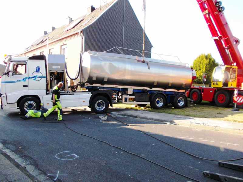 Durch den Aufprall wurde das Fahrzeug jedoch stark zerstört. Der Behälter des Tankaufliegers, der mit Frischmilch befüllt war, ist durch die Kollision mit der Hauswand geborsten. Die transportierte Frischmilch ist ausgetreten und wurde in weiten Teilen auf nahe gelegenen Rasen- und Straßenflächen verteilt.