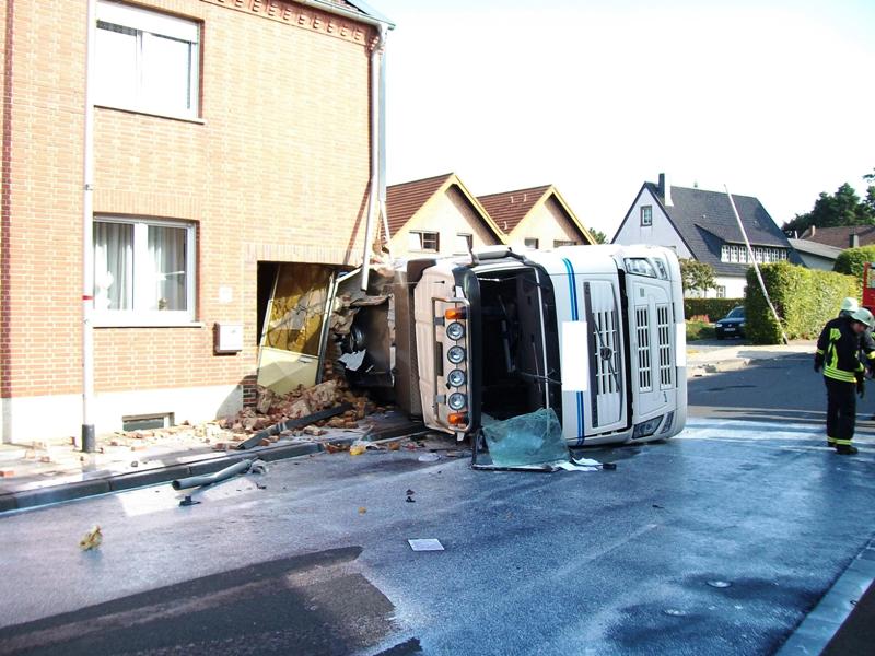 Aus bislang noch ungeklärter Ursache ist dieser in einer langgezogenen Kurve umgekippt und seitlich in eine Hauswand geprallt. Entgegen der ersten Alarmierung war der Fahrer des LKW nicht in seinem Fahrzeug eingeklemmt und konnte durch Feuerwehr und Rettungsdienst ohne die Zuhilfenahme von schwerem Rettungsgerät aus seinem Fahrzeug befreit werden.