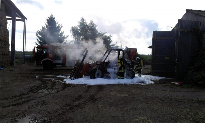 Vor Ort stellten die Einsatzkräfte der Feuerwehr Selfkant fest, dass in der Scheune eines landwirtschaftlichen Anwesens "An der Tränke" in Wehr ein Teleskoplader in Vollbrand stand. Um weiteren Schaden von der Scheune abzuwenden, wurde der Teleskoplader aus der Scheune befördert. Einsatzkräften unter schwerem Atemschutz löschten das brennende Fahrzeug vor der Scheune mit Schaum ab. Mit Hilfe einer Wärmebildkamera wurde die Scheune auf Glutnester kontrolliert, damit diese gezielt abgelöscht werden konnten. Der ebenfalls alarmierte Rettungsdienst musste einen Anwohner mit Verdacht auf Rauchgasintoxikation behandeln und ins Krankenhaus transportieren. Nach rund einer Stunde waren die letzten Glutnester in der Scheune und der Teleskoplader gelöscht, so dass die Feuerwehr einrücken konnte. Eingesetzt waren die Löscheinheiten Süsterseel/Hillensberg, Höngen/Saeffelen, Tüddern/Millen, Havert/Schalbruch sowie die Drehleiter der Feuerwehr Gangelt.