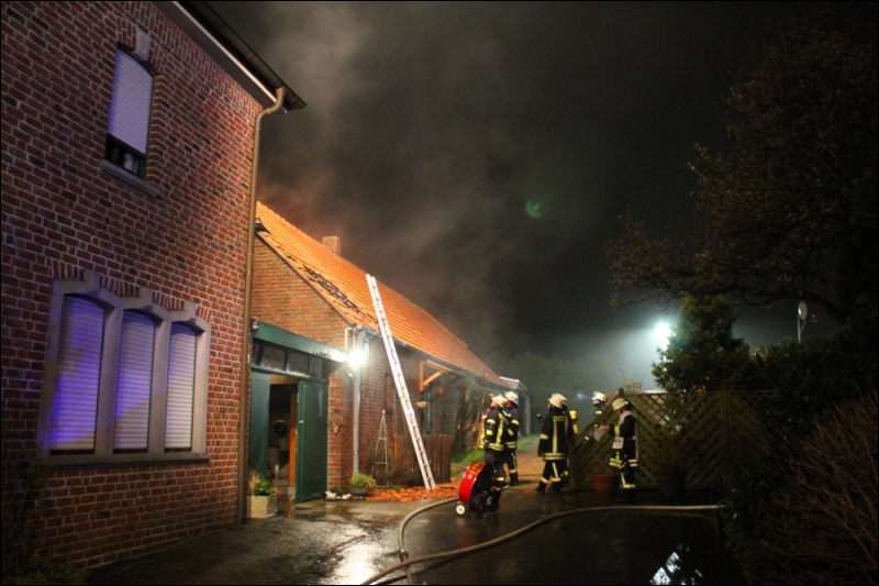 Anwohner bemerkten gegen 3 Uhr nachts eine starke Rauchentwicklung in ihrem Wohnhaus und alarmierten die Feuerwehr. Als die Feuerwehr kurze Zeit später an der Einsatzstelle eintraf, befanden sich noch mehrere Bewohner im Gebäude. Die Einsatzkräfte führten die Bewohner aus dem Gebäude und übergaben sie dem Rettungsdienst, der mit mehreren Rettungswagen und einem Notarzt vor Ort war. Kurz nachdem die Bewohner im Rettungswagen untersucht wurden, schlugen erste Flammen aus dem Dach des angrenzenden Gebäudes. Die Feuerwehr brachte den Brand schnell unter Kontrolle und löschte die Flammen ab. Anschließend wurde das Wohnhaus mit mehreren Hochleistungslüftern entraucht. Nach rund zwei Stunden konnte der Einsatz für die etwa 50 Einsatzkräfte unter der Leitung von Gemeindebrandinspektor Günter Paulzen beendet werden.