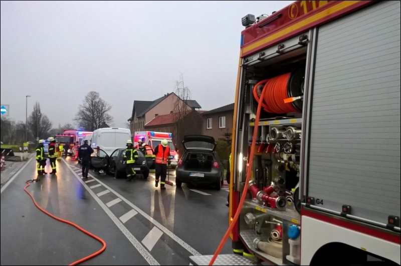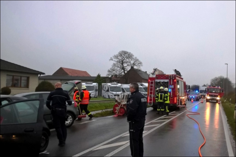 Die Einheiten Gangelt und Stahe-Niederbusch sowie die Bauhofstaffel der Feuerwehr Gangelt wurden heute Nachmittag um 15:46 Uhr zusammen mit Rettungsdienst und Polizei zu einem Verkehrsunfall auf der Bundesstraße in Stahe alarmiert.