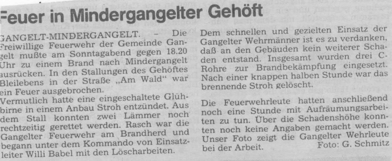 Vermutlich hatte eine eingeschaltete Glühbirne in einem Anbau Stroh entzündet. Aus dem Stall konnten noch schnell vor Eintreffen der Gangelter Wehr rechtzeitig zwei Lämmer gerettet werden. Durch rasches Eingreifen konnte hier die Gangelter Wehr unter der Leitung des Löschzugführers Willi Babel ein größeres Ausmaß verhindert werden. Einsatz von schwerem Atemschutz, Steckleitern und drei C-Rohren.