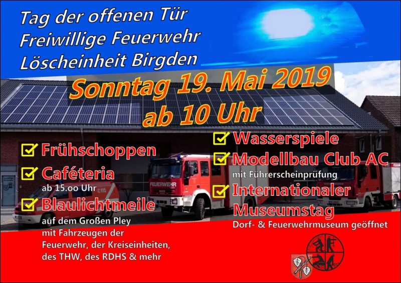 Dabei verwandelt sich der Große Pley in eine Blaulichtmeile. Neben den Fahrzeugen der Löscheinheit Birgden werden hier die Drehleiter und der Rüstwagen aus Gangelt zu besichtigen sein. Die Kreiseinheiten der Feuerwehr werden sich ebenfalls präsentieren, unter anderem wird sich die Wasserrettungseinheit mit ihrem Tauchcontainer präsentieren. Der Rettungsdienst des Kreises Heinsberg wird ebenfalls mit einem Infostand vor Ort sein. Der Ortsverband des Technischen Hilfswerkes aus Übach-Palenberg wird ebenfalls einige Fahrzeuge ausstellen