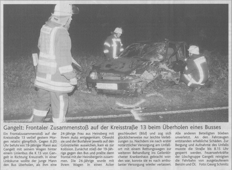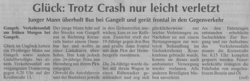 Bei dem Versuch einen Bus zu überholen stieß ein PKW aus Richtung Gangelt mit einem entgegenkommenden Fahrzeug frontal zusammen. Auch der Bus wurde bei dem Unfall beschädigt. Zum Glück wurde nur eine Beteiligte leicht verletzt.