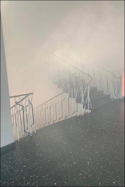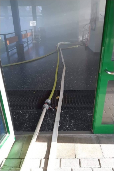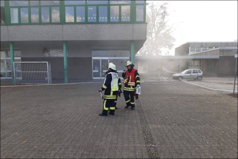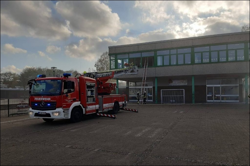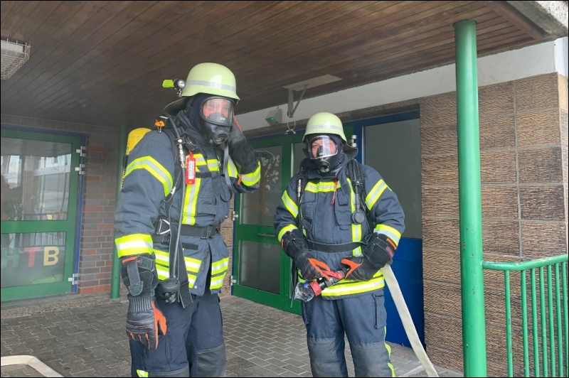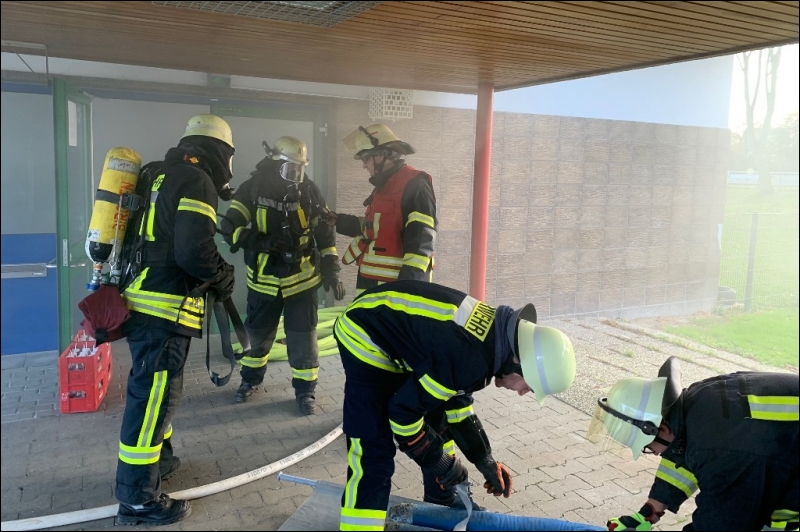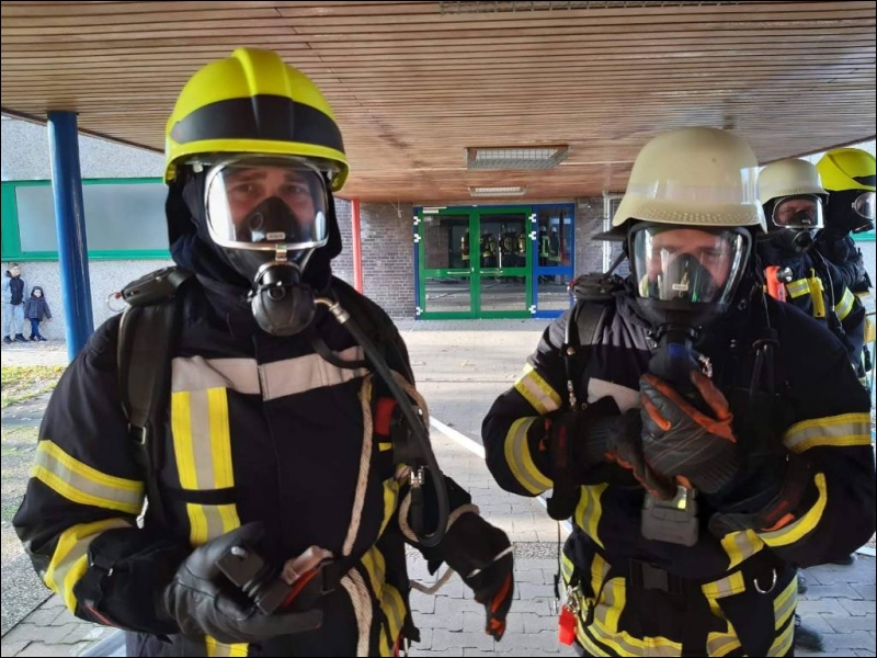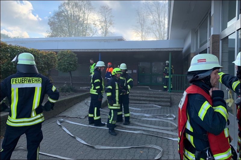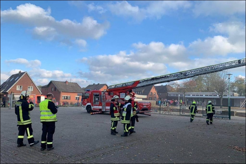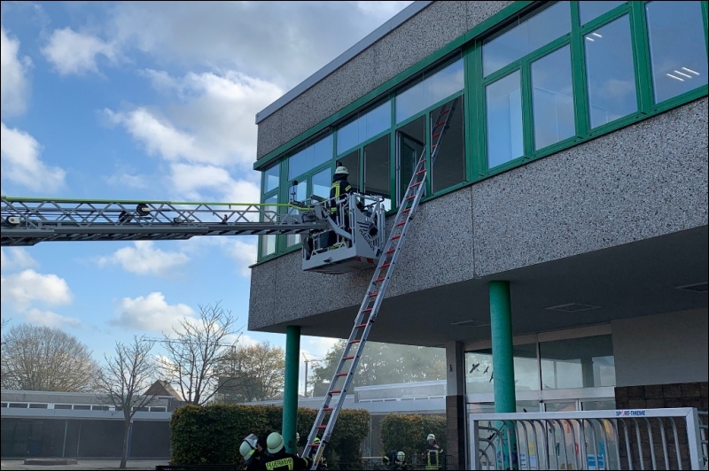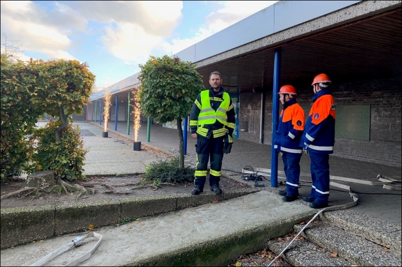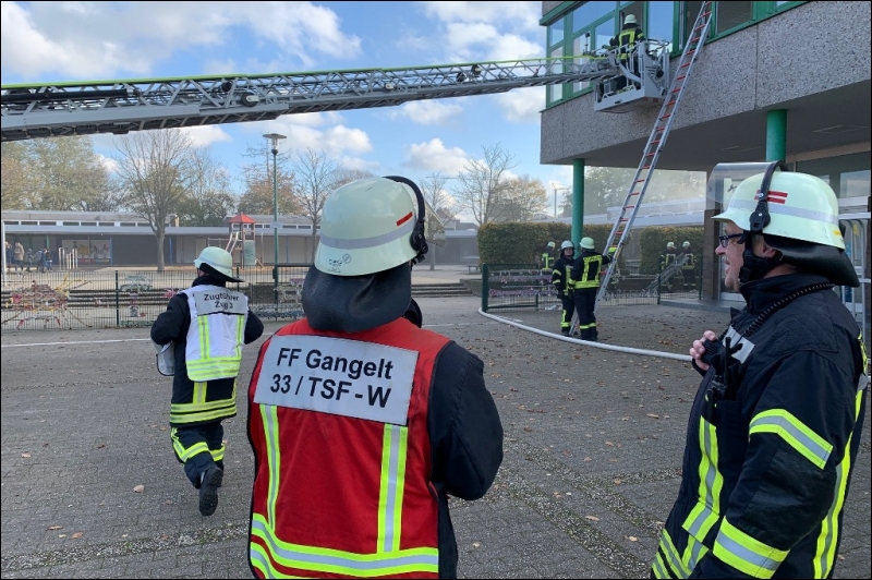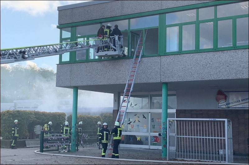 Mit dieser Alarmmeldung wurden die Einsatzkräfte der Feuerwehr Gangelt am vergangenen Wochenende zu einer Alarmübung nach Breberen alarmiert. Vor Ort erwartete die Einsatzkräfte der Feuerwehr ein überaus echtwirkendes Übungsszenario. Dichter Rauch, simuliert mit Diskonebel, drang aus dem Schulgebäude, feuerähnliche Lichteffekte simulierten den Brandherd, der Evakuierungsalarm der Schule ertönte über das komplette Gelände und das Lehrpersonal mit einigen Kinder standen an den Fenstern im ersten Obergeschoss und riefen um Hilfe. Für die Einsatzkräfte der Feuerwehr begann nun ein Wettlauf gegen die Zeit. Während mehrere Trupps unter schwerem Atemschutz im Keller nach den vermissten Arbeitern suchten, wurden mit Hilfe der Drehleiter die Kinder und Lehrerinnen aus dem ersten Obergeschoss in Sicherheit gebracht. Da die Chemieeinrichtung des Lehrschwimmbades der Grundschule ebenfalls vom Brand betroffen war, wurden seitens der Feuerwehr Messungen durchgeführt und die die Chemischen Stoffe aus dem Gefahrenbereich geschafft.