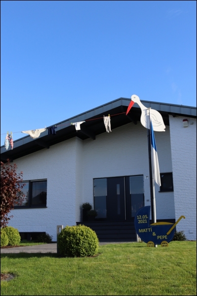Nach einer Legende schenkt ein Storch als Dank dafür das er auf den Dächern nisten darf, der Familie ein Baby. Hierbei lässt der Storch die Kinder durch den Schornstein in das Schlafzimmer der Eltern plumpsen. Aus diesem Grund wird auch heute noch nach der Geburt symbolisch ein Holzstorch vor dem Elternhaus aufgestellt. Bei Nachwuchs aus den Reihen der Feuerwehr, darf diese wunderbare Tradition, wie zuletzt in Gangelt, trotz Corona-Beschränkungen nicht fehlen. Diesmal fiel jedoch das traditionelle Babypinkeln aus, dies wird jedoch später nachgeholt.