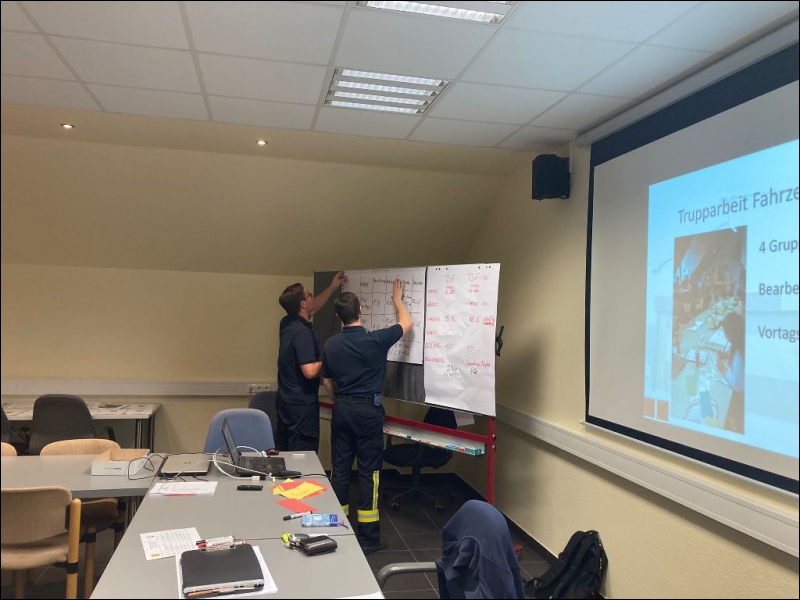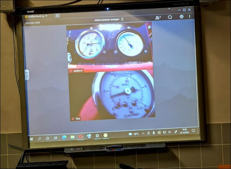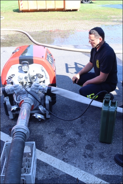 Der Schwerpunkt des Lehrgangs „Maschinist für Löschfahrzeuge“ liegt jedoch auf der Handhabung von Feuerlöschkreiselpumpen. Im Einsatzfall braucht der vorgehende Angriffstrupp möglichst schnell ausreichend Löschwasser an seinem Strahlrohr. Hierbei bedient der Maschinist die eingebaute oder tragbare Pumpe und achtet dass der Ausgangsdruck am Strahlrohr stimmt. Das Löschwasser wird dabei entweder vom eingebauten Fahrzeugtank, über Hydranten aus dem Trinkwassernetz oder aus offenen Gewässern wie dem Rodebach, dem Saeffelbach oder aus Weihern und Seen entnommen. Eine besondere Herausforderung bildet hierbei, wenn die Wasserentnahmestelle weit entfernt von der Einsatzstelle liegt. Damit an der Einsatzstelle ausreichend Löschwasser zur Verfügung steht, muss bei längeren Wegstrecken berechnet werden, ob und wo weitere Pumpen als Verstärkung eingesetzt werden müssen. Der Druckverlust bei Steigungen wurde anhand der Drehleiter demonstriert. Auf verschiedenen Höhen konnten die Lehrgangsteilnehmer ablesen, wie sich der Wasserdruck an dem Strahlrohr im Korb der Drehleiter verändert. Dabei nutzte das Ausbilderteam auch die heutigen Möglichkeiten. Per Webkonferenz wurde die Druckanzeige aus dem Korb der Drehleiter nach unten zu den Teilnehmern live übertragen.